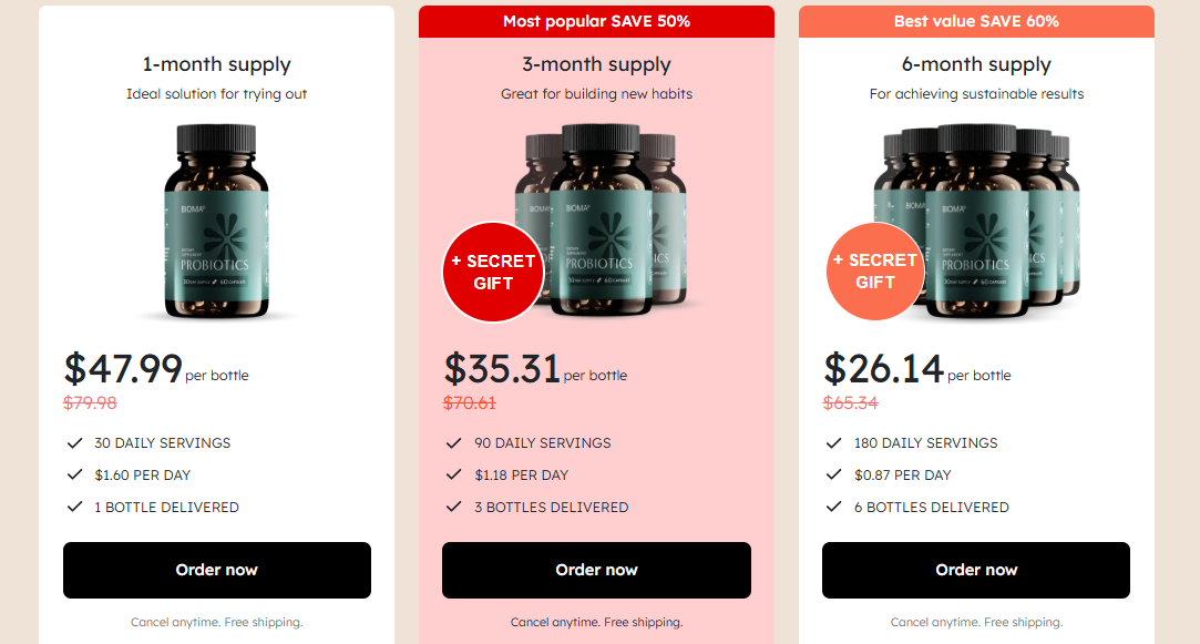 The price of Bioma Probiotics depends on how many bottles you purchase at once. Typically, buying in bundles saves you more money compared to a single bottle.